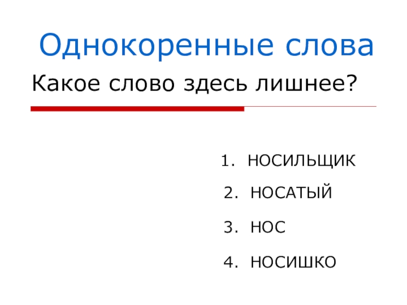 Однокоренные словаКакое слово здесь лишнее?1. НОСИЛЬЩИК2. НОСАТЫЙ3. НОС4. НОСИШКО