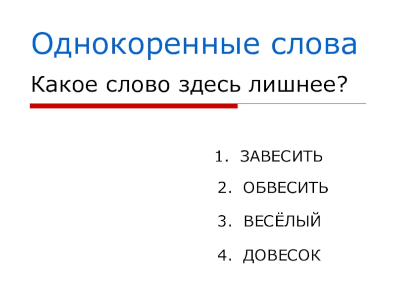 Однокоренные словаКакое слово здесь лишнее?1. ЗАВЕСИТЬ2. ОБВЕСИТЬ3. ВЕСЁЛЫЙ4. ДОВЕСОК