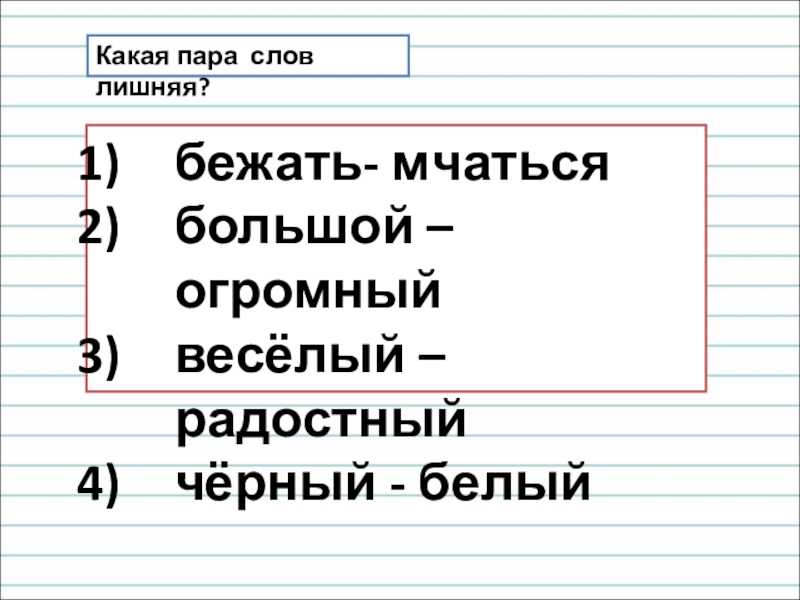 Какая пара слов лишняя?бежать- мчатьсябольшой – огромныйвесёлый – радостныйчёрный - белый