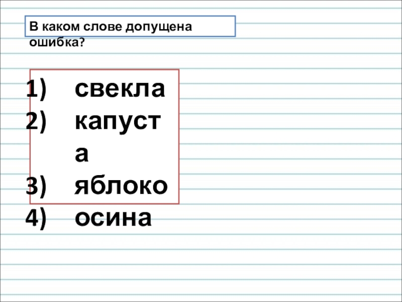 В каком слове допущена ошибка?свекла капуста яблоко осина