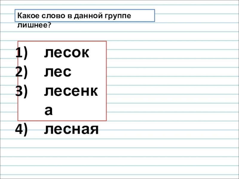 Какое слово в данной группе лишнее?лесок лес лесенка лесная