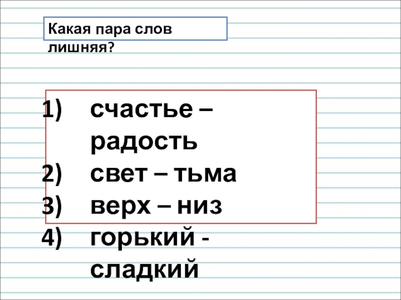 Какая пара слов лишняя?счастье – радостьсвет – тьма верх – низгорький - сладкий