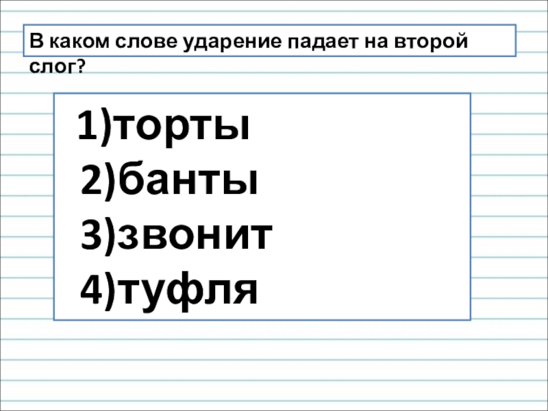 В каком слове ударение падает на второй слог? 1)торты 2)банты 3)звонит 4)туфля