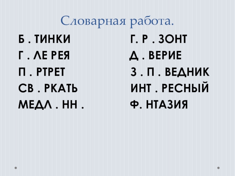 Словарная работа.Б . ТИНКИ Г. Р . ЗОНТГ . ЛЕ РЕЯ Д . ВЕРИЕП . РТРЕТ