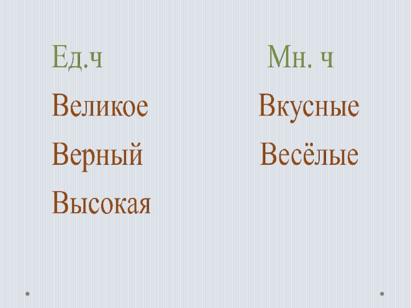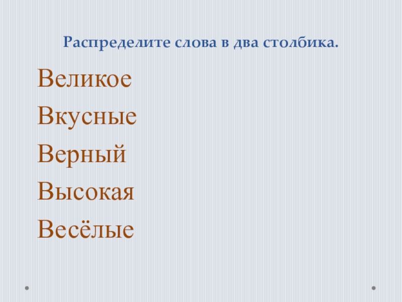 Распределите слова в два столбика.ВеликоеВкусные ВерныйВысокая Весёлые