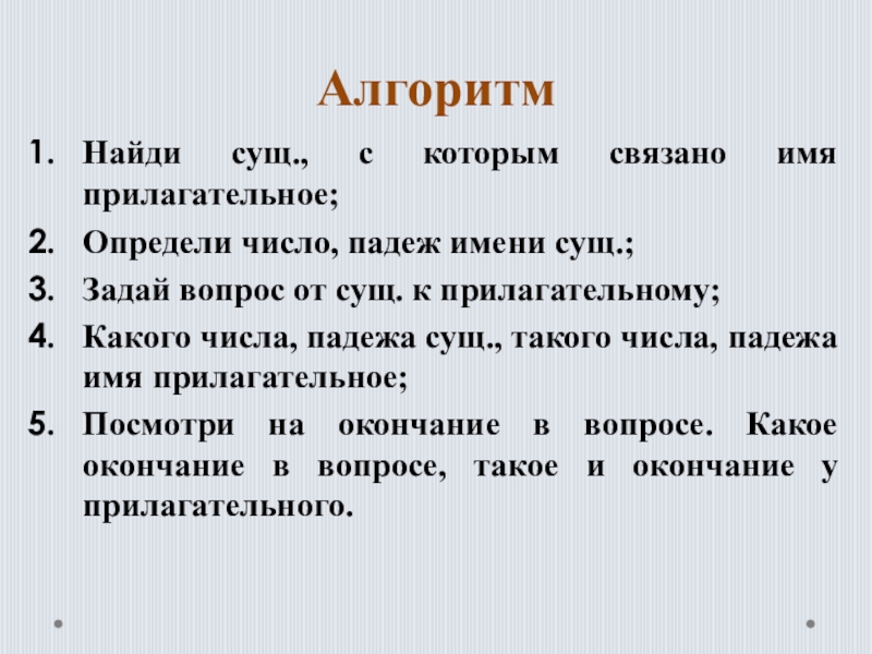 Алгоритм Найди сущ., с которым связано имя прилагательное;Определи число, падеж имени сущ.; Задай вопрос от сущ. к