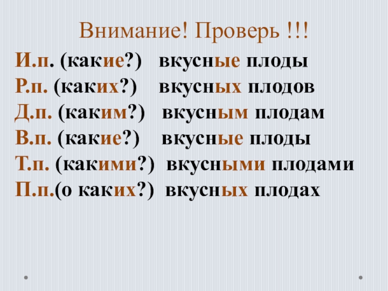 Внимание! Проверь !!!И.п. (какие?)  вкусные плодыР.п. (каких?)  вкусных плодовД.п. (каким?)  вкусным плодамВ.п. (какие?)