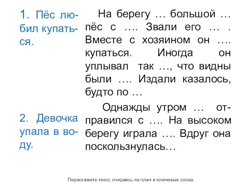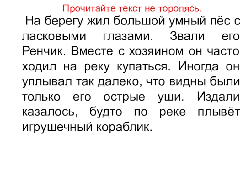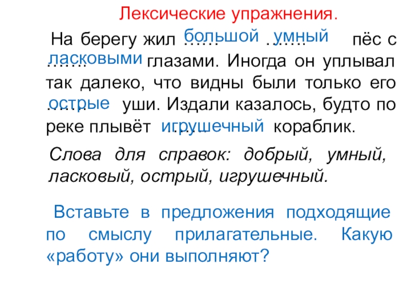 На берегу жил …… ……. пёс с ……. глазами. Иногда он уплывал так далеко, что видны были только его ……. уши. Издали казалось, будто по реке плывёт ……. кораблик.