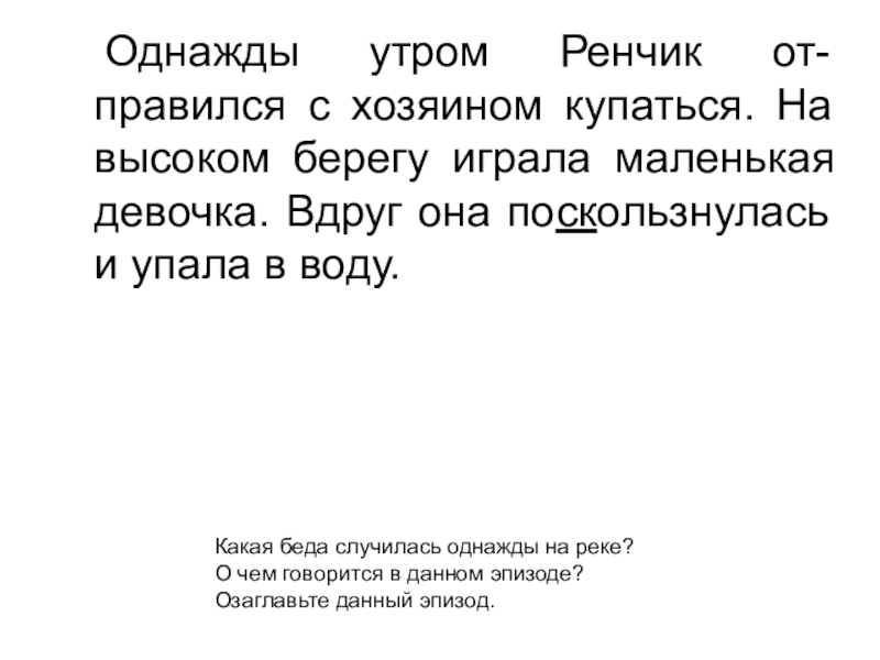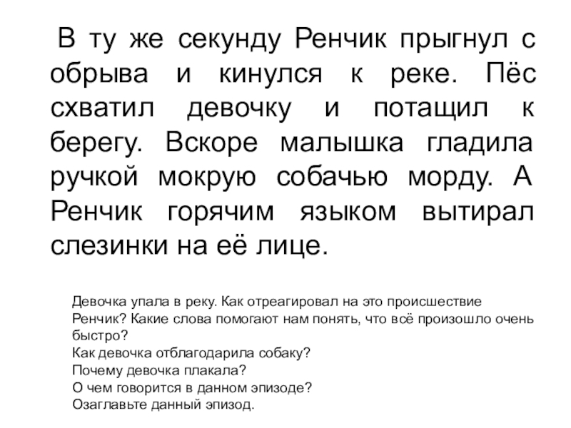 Девочка упала в реку. Как отреагировал на это происшествие Ренчик? Какие слова помогают нам понять, что всё произошло очень быстро?