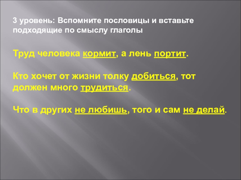 3 уровень: Вспомните пословицы и вставьте подходящие по смыслу глаголы