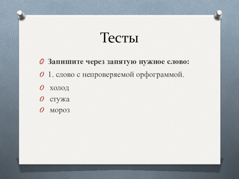 ТестыЗапишите через запятую нужное слово:1. слово с непроверяемой орфограммой. холод стужа мороз
