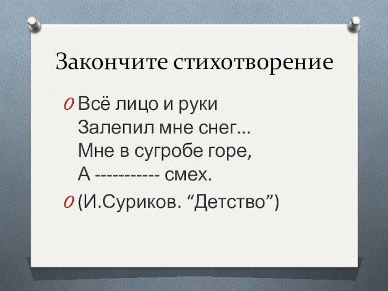 Закончите стихотворениеВсё лицо и руки Залепил мне снег... Мне в сугробе горе, А ----------- смех. (И.Суриков. “Детство”)