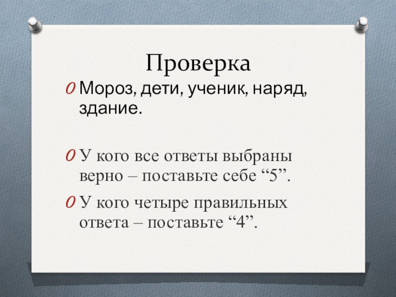 ПроверкаМороз, дети, ученик, наряд, здание.У кого все ответы выбраны верно – поставьте себе “5”.У кого четыре правильных