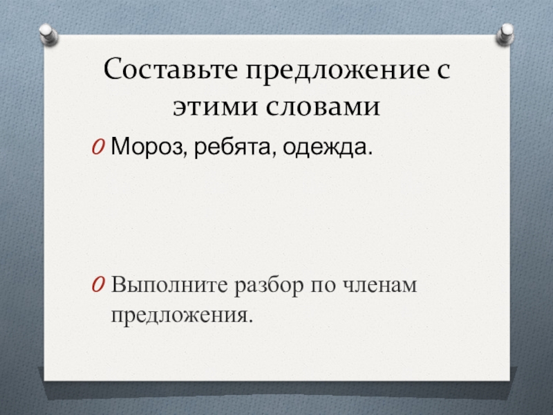 Составьте предложение с этими словамиМороз, ребята, одежда.Выполните разбор по членам предложения.