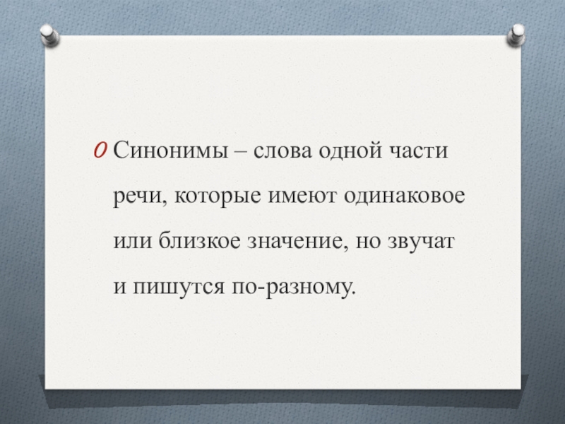Синонимы – слова одной части речи, которые имеют одинаковое или близкое значение, но звучат и пишутся по-разному.