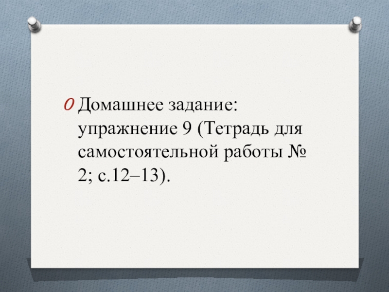 Слайд 17Домашнее задание: упражнение 9 (Тетрадь для самостоятельной работы № 2; с.12–13).