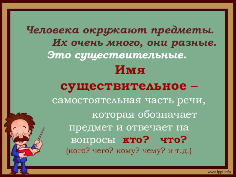 которая обозначает предмет и отвечает на вопросы кто? что? (кого? чего? кому? чему? и т.д.)