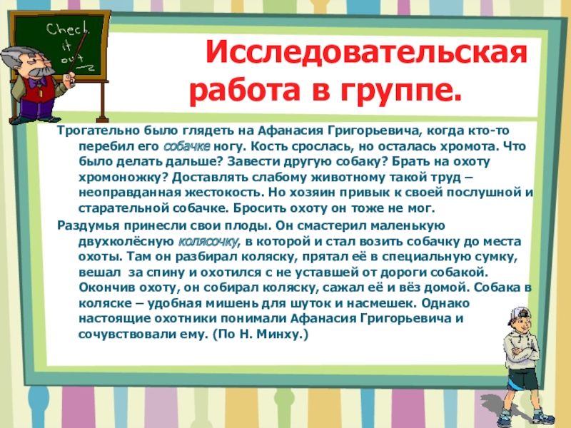 Раздумья принесли свои плоды. Он смастерил маленькую двухколёсную колясочку, в которой и стал возить собачку до места охоты. Там он разбирал коляску, прятал её в специальную сумку, вешал за спину и охотился с не уставшей от дороги собакой. Окончив охоту, он собирал коляску, сажал её и вёз домой. Собака в коляске – удобная мишень для шуток и насмешек. Однако настоящие охотники понимали Афанасия Григорьевича и сочувствовали ему. (По Н. Минху.)