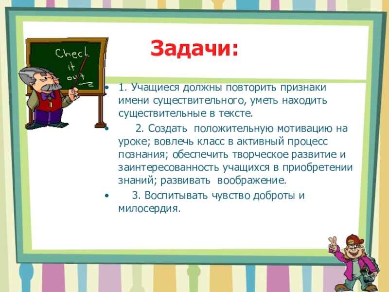 1. Учащиеся должны повторить признаки имени существительного, уметь находить существительные в