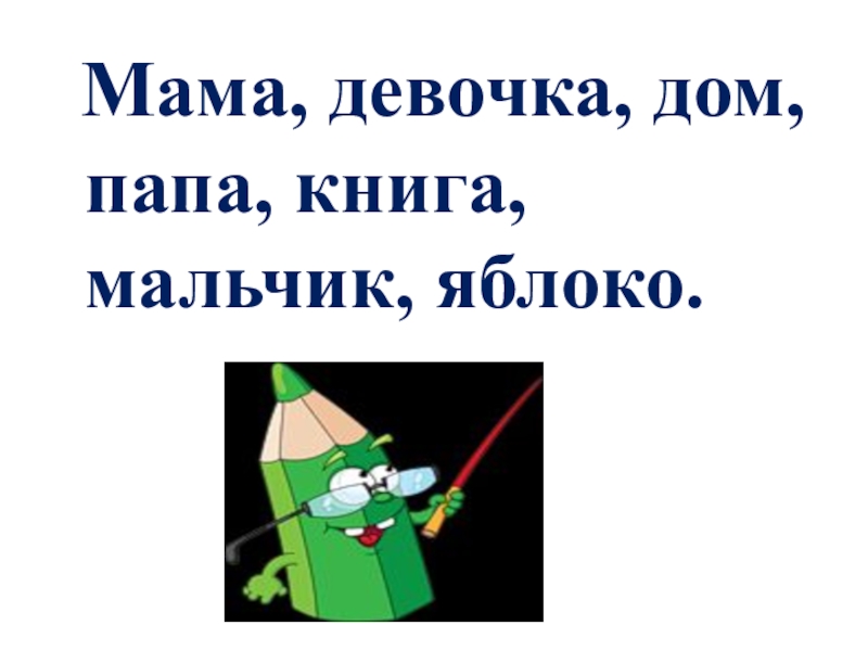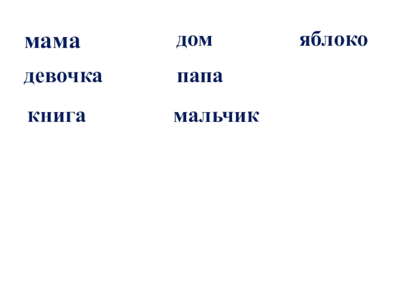Слайд 2 Мама, девочка, дом, папа, книга, мальчик, яблоко.