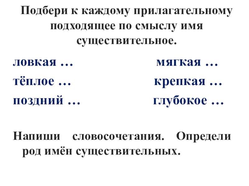 Подбери к каждому прилагательному подходящее по смыслу имя существительное.ловкая …