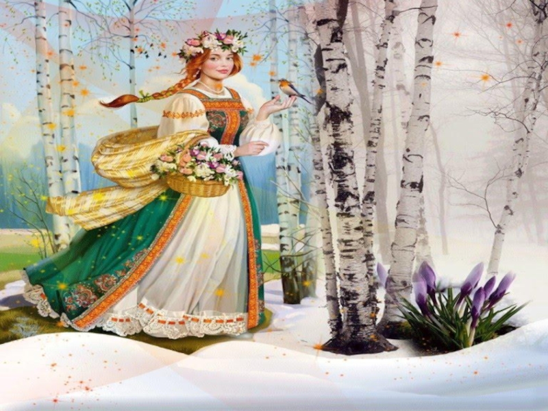 Слайд 12В лесу тает снег. На дереве сидят грачи. С пригорка бежит