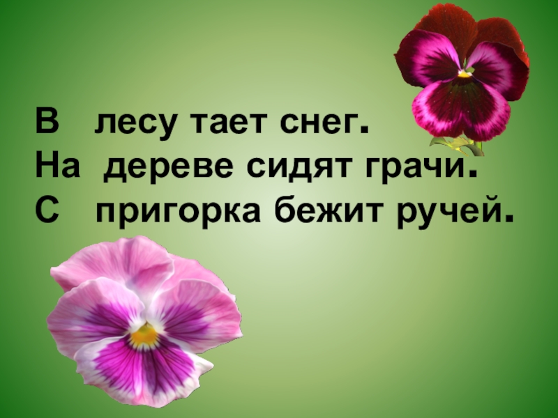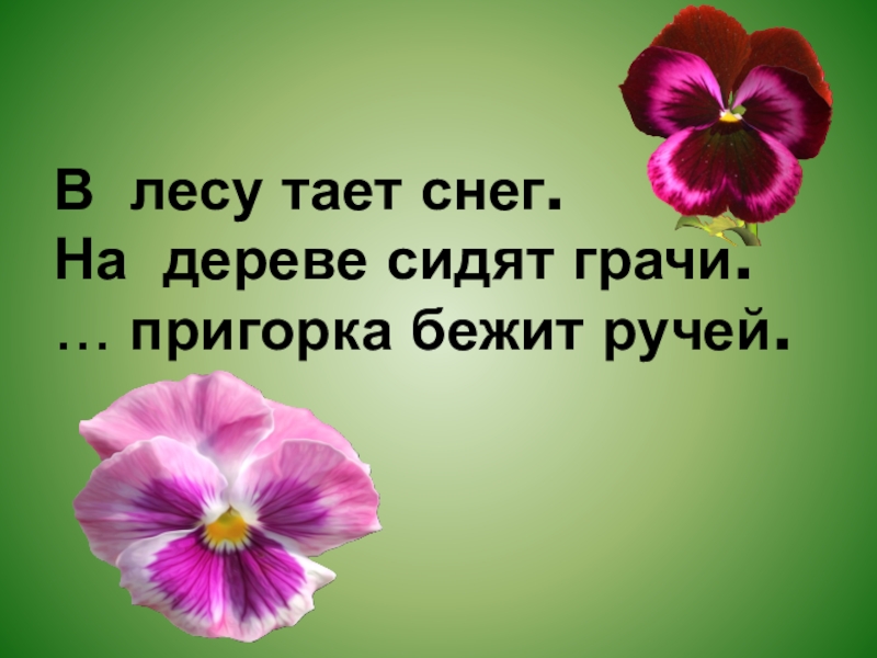 …  лесу тает снег. … дереве сидят грачи. … пригорка бежит ручей.