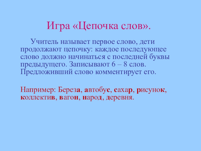 Учитель называет первое слово, дети продолжают цепочку: каждое последующее