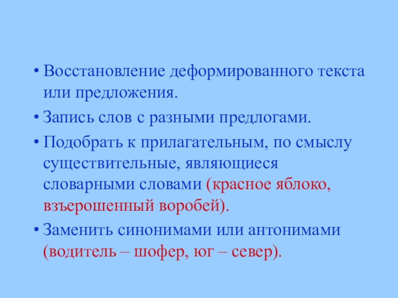 Восстановление деформированного текста или предложения.