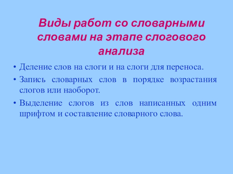 Слайд 9Виды работ со словарными словами на этапе слогового анализа