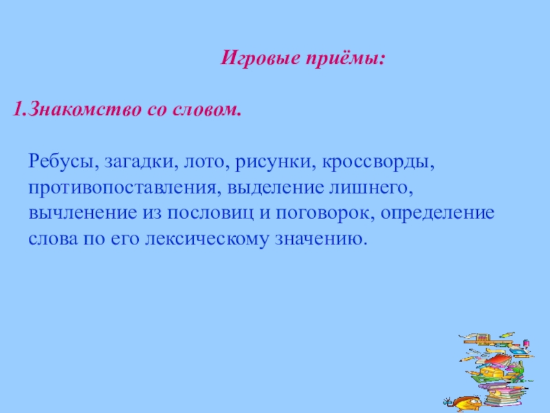Ребусы, загадки, лото, рисунки, кроссворды, противопоставления, выделение лишнего, вычленение из пословиц и поговорок, определение слова по его лексическому значению.