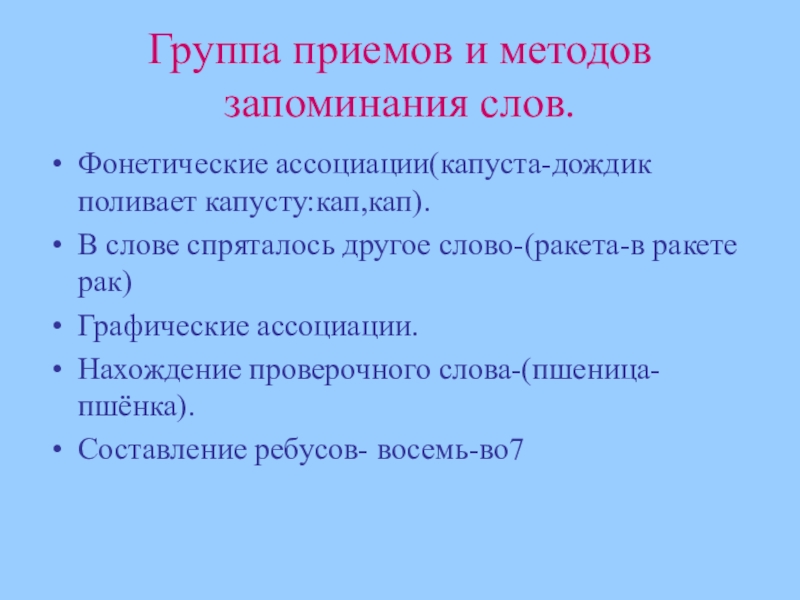 Слайд 28Группа приемов и методов запоминания слов.