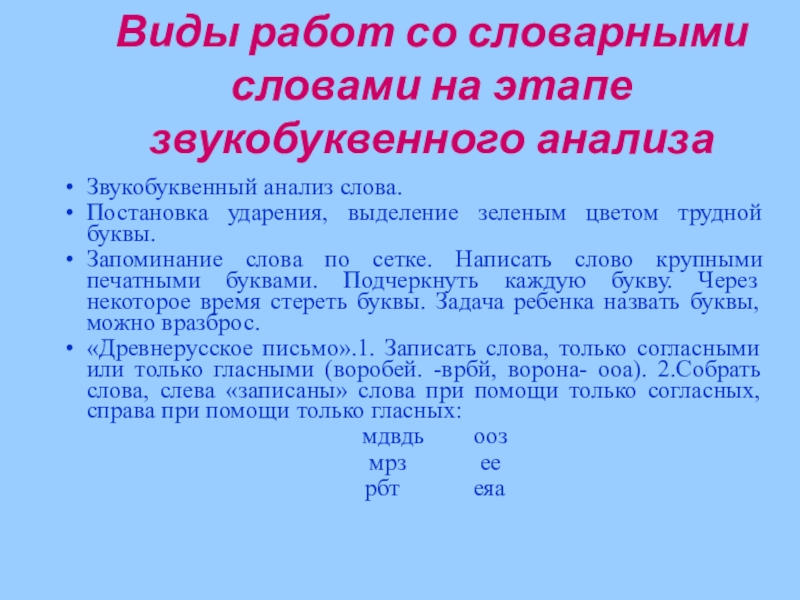 Слайд 7Виды работ со словарными словами на этапе звукобуквенного анализа