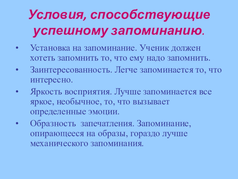 Слайд 5Условия, способствующие успешному запоминанию.