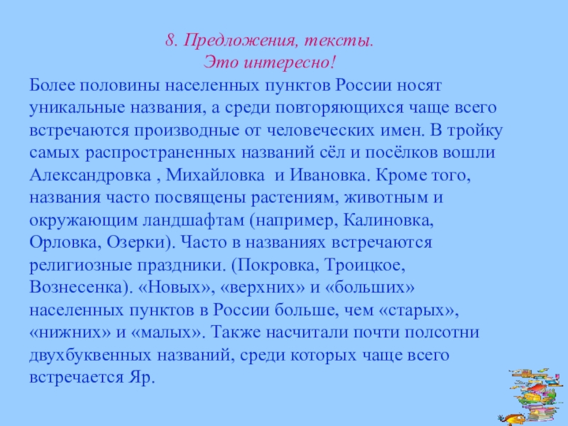 населенных пунктов России носят уникальные названия, а среди повторяющихся чаще всего встречаются производные от человеческих имен. В тройку самых распространенных названий сёл и посёлков вошли Александровка , Михайловка и Ивановка. Кроме того, названия часто посвящены растениям, животным и окружающим ландшафтам (например, Калиновка, Орловка, Озерки). Часто в названиях встречаются религиозные праздники. (Покровка, Троицкое, Вознесенка). «Новых», «верхних» и «больших» населенных пунктов в России больше, чем «старых», «нижних» и «малых». Также насчитали почти полсотни двухбуквенных названий, среди которых чаще всего встречается Яр.