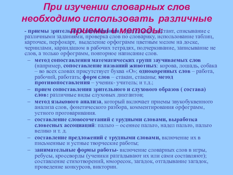 Слайд 4При изучении словарных слов необходимо использовать различные приемы и методы: