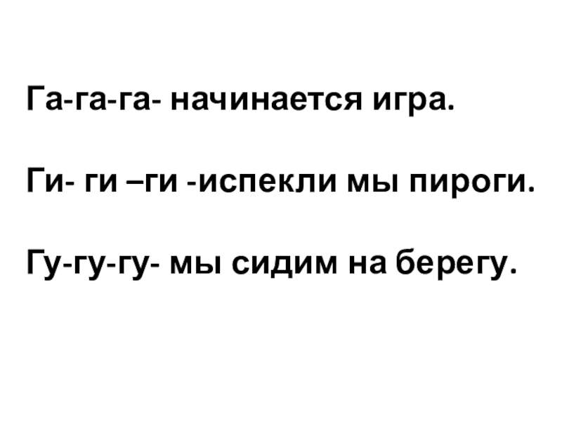 Га-га-га- начинается игра.Ги- ги –ги -испекли мы пироги.Гу-гу-гу- мы сидим на берегу.