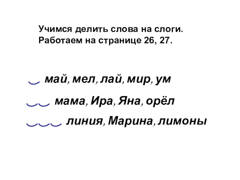 май, мел, лай, мир, уммама, Ира, Яна, орёллиния, Марина, лимоныУчимся делить слова на слоги.Работаем на странице 26,