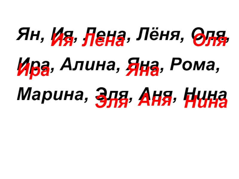 Ян, Ия, Лена, Лёня, Оля,Ира, Алина, Яна, Рома,Марина, Эля, Аня, НинаИяЛенаОляИраЯнаЭляАняНина