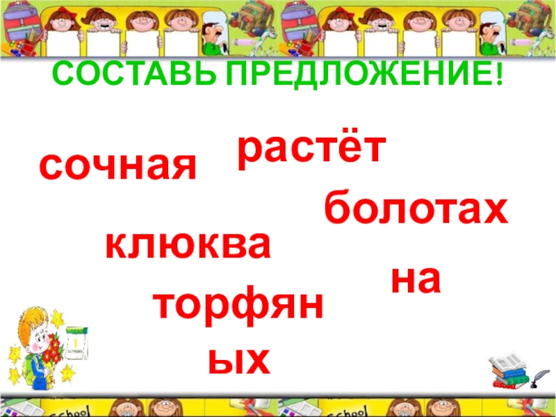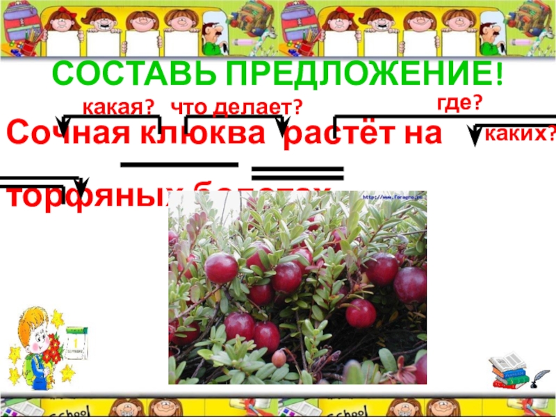 СОСТАВЬ ПРЕДЛОЖЕНИЕ!сочная клюкварастёт наторфяных болотах Сочная