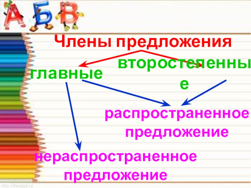 Члены предложенияглавныевторостепенные нераспространенное предложение распространенное предложение