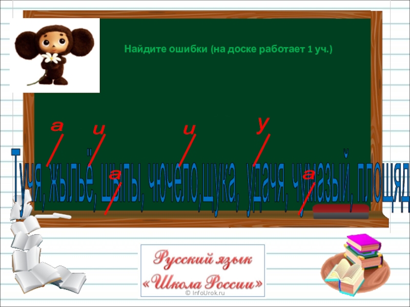 © InfoUrok.ruТучя, жыльё, шыпы, чючело,щука, удачя, чумазый, площядка. а и и а а у Найдите ошибки (на доске работает 1 уч.)