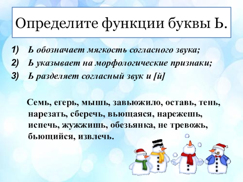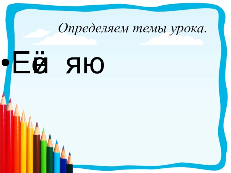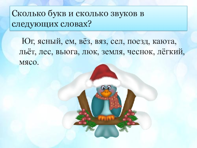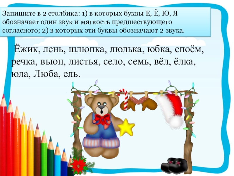 Ёжик, лень, шлюпка, люлька, юбка, споём, речка, вьюн, листья, село, семь, вёл, ёлка, юла, Люба, ель.