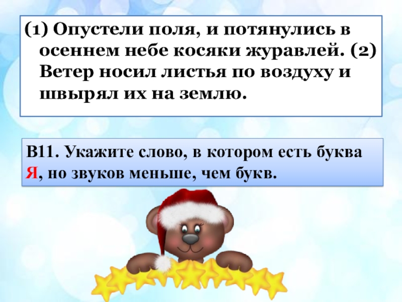 В11. Укажите слово, в котором есть буква Я, но звуков меньше, чем букв.