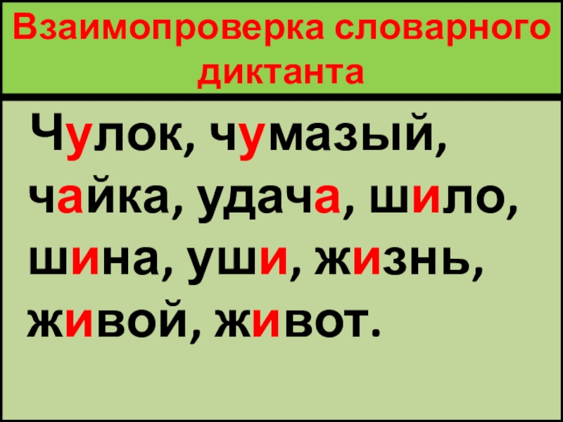 Взаимопроверка словарного диктанта Чулок, чумазый, чайка, удача, шило, шина, уши, жизнь, живой, живот.