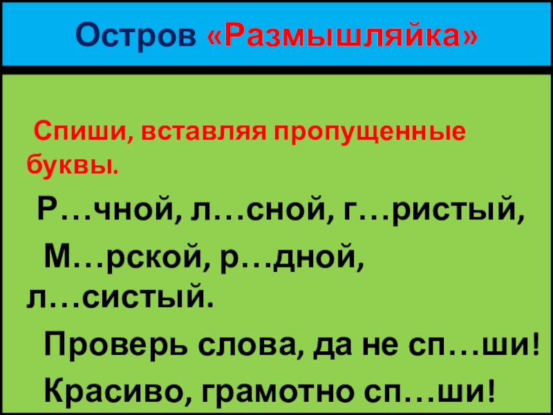 Остров «Размышляйка»        Спиши, вставляя пропущенные буквы.   Р…чной, л…сной,