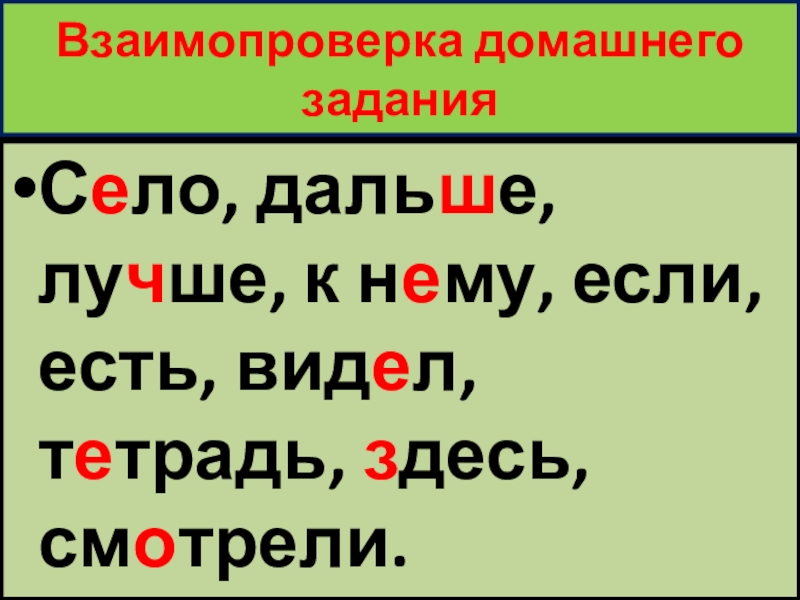 Взаимопроверка домашнего заданияСело, дальше, лучше, к нему, если, есть, видел, тетрадь, здесь, смотрели.