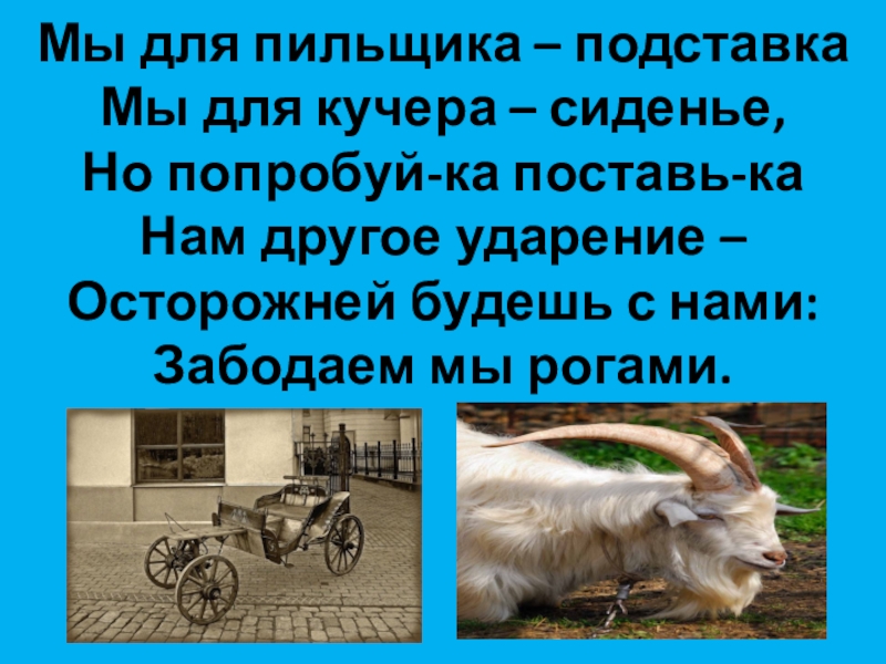 Но попробуй-ка поставь-ка Нам другое ударение – Осторожней будешь с нами: Забодаем мы рогами.