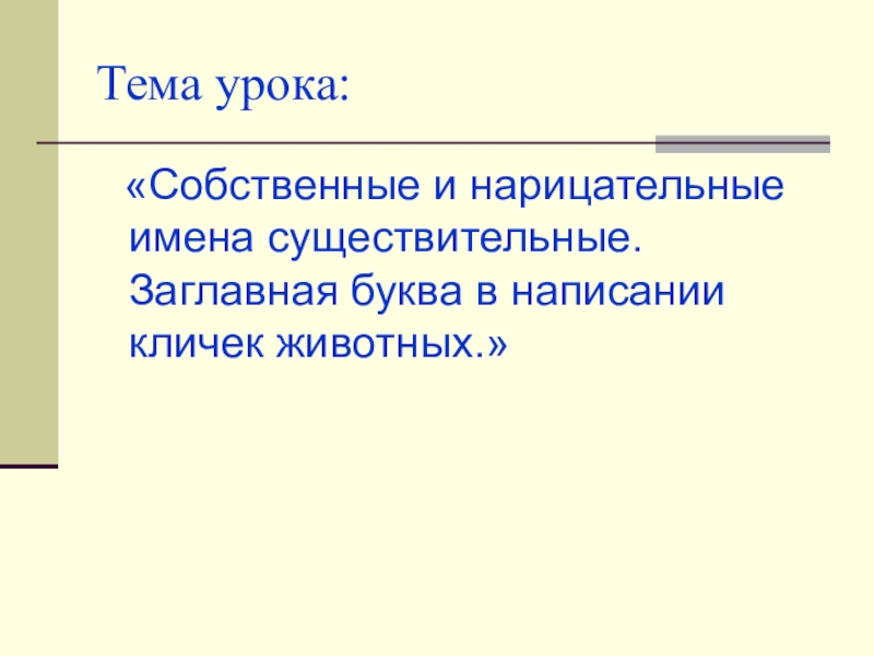 Тема урока:  «Собственные и нарицательные имена существительные. Заглавная буква в написании кличек животных.»