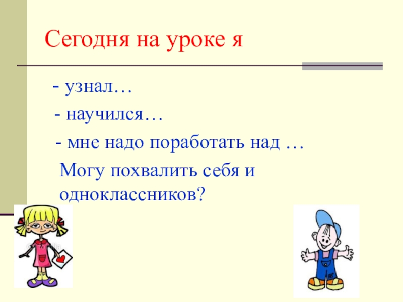 Сегодня на уроке я - узнал… - научился… - мне надо поработать над …  Могу похвалить